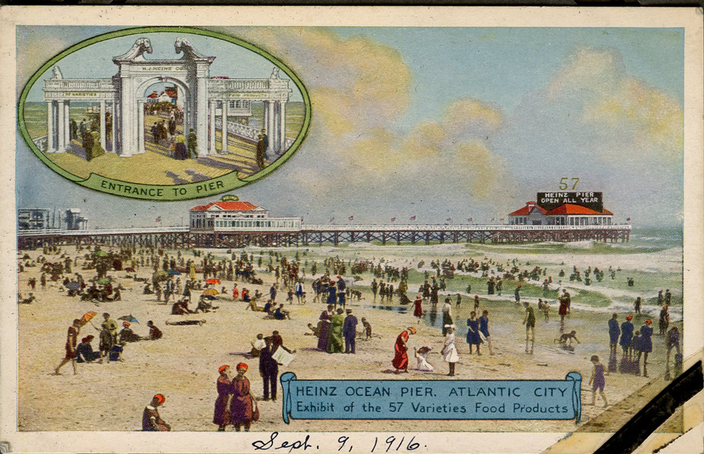 Sept. 9th – Sid and I went to Atlantic City and my first view of the Atlantic Ocean. Too cold to go in bathing, but walked up and down the famous board-walk. An airplane kept flying over the City and was quite thrilling (a rarity in 1916 since we have seen very few planes).  Also, visited the Heinz Bldg. at the end of the Pier. All 57 varieties on display and such a beautiful building, too.