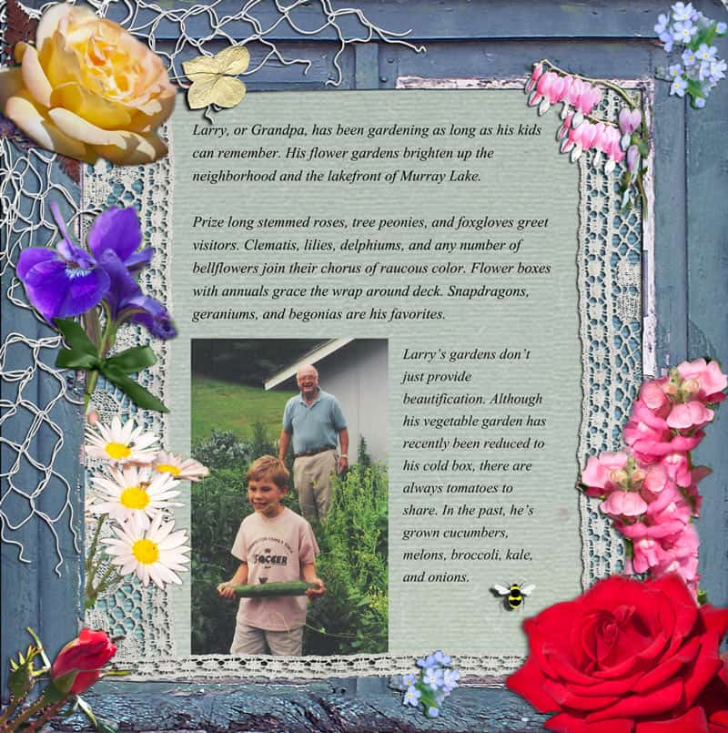 Memories about a gardener or garden really need photos or illustrations of some sort. A scrapbook layout (digital or paper) is a great way to remember or honor the gardener in your life. Mine is digital, but yours doesn’t have to be.