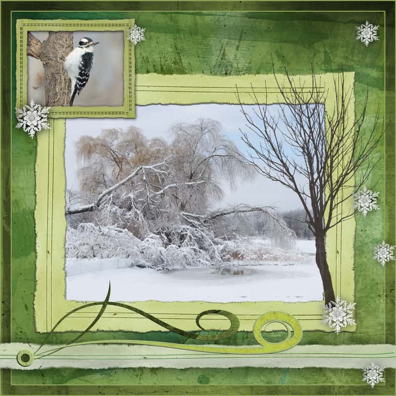 Usually I start with a narrative, but this time I didn’t. I simply choose two photographs I wanted to show case. I started a 12” x 12” new page and started pulling the layers onto my work area. I added snowflakes that were not part of the kit to help pull the white of the now outside of the framed area.
