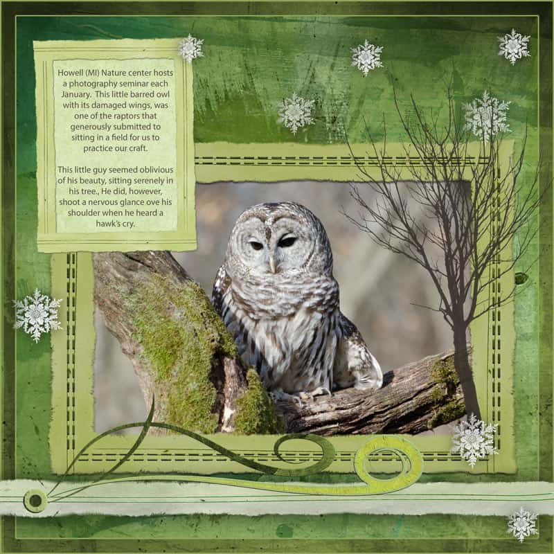 Love the layouts! I especially like the owl page. The green “paper” and the green moss really make the owl stand out. Gorgeous!